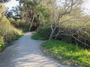 Lovely path beside a eucalyptus forest, on both sides of the creek, with workout stations, in a residential neighborhood. You can walk two miles total. Also called San Luis Ranch.