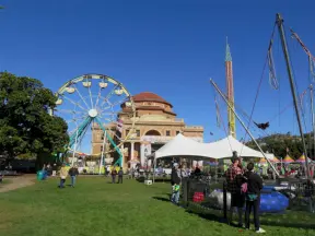 Waterfront area with restaurants, live street performers, entertainment, toy stores, and carousel.