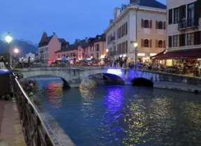 Palais de l'Ile is the most adorable medieval prison in the middle of the River Thiou in old town Annecy. See it lit up at night.