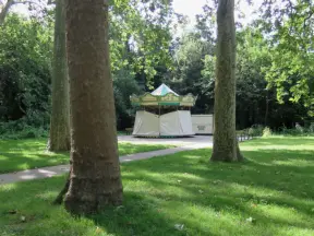 Memorable park with long cable to zipline on, and water play area you pump water into. Many trees, and benches for parents.