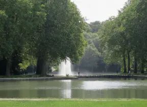 A beautiful park with a grand canal, an impressively high fountain, flower beds, a chateau, and the loveliest trees.