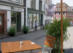 Town center with historic storefronts, large square, stone church, and outdoor cafes with flowerboxes.