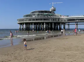 Popular beach with large pier, wide boardwalk, aquarium, grand 1880s hotel, and cafes.