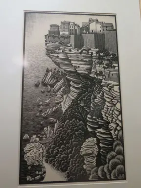 Beautiful palace in square full of trees, with strange and wonderful paintings and illustrations by M. C. Escher.