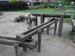 Memorable park with long cable to zipline on, and water play area you pump water into. Many trees, and benches for parents.