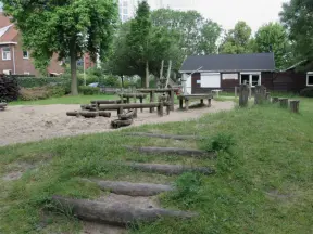 Memorable park with long cable to zipline on, and water play area you pump water into. Many trees, and benches for parents.