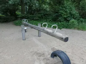 Memorable park with long cable to zipline on, and water play area you pump water into. Many trees, and benches for parents.
