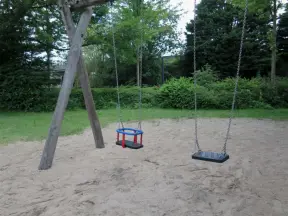 Huge wooden castle playground, interesting exercise station, and birds on a pond.