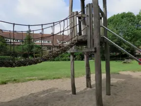 Memorable park with long cable to zipline on, and water play area you pump water into. Many trees, and benches for parents.