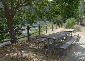 Medium-sized playground, huge lawn, beautiful trees, basketball court, and picnic tables with BBQ pit above the creek.