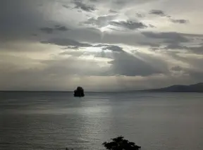 A tiny black sand beach, emerald green springs, grassy knolls, a lifeguard, and warm-water swimming or body boarding.