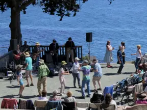 Stretch of grass with a paved walkway, flower beds, wonderful ocean views to Avila Beach, and monterey cypress trees.
