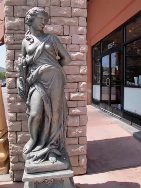 Sunny town with a cute main street, and City Hall with beautiful Sunken Garden with sculptures, tall old trees including magnolia trees, and fountains.