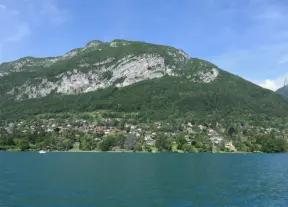 Lakeside park like an arboretum, with tall amazing trees from around the world, statues, modern art sculptures, stunning mountain views, ironwork lovers bridge, and promenade along the blue-green lake.