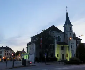 Town center with historic storefronts, large square, stone church, and outdoor cafes with flowerboxes.