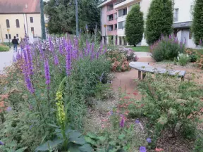 Fairly plain garden with some flowers, herbs, giant chess set, and sectioned off walkways for kids to run around.
