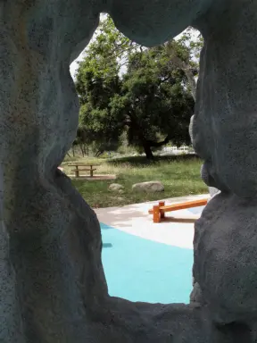 A playground with giant concrete slide, in a bowl surrounded by forest in the hills above Berkeley.