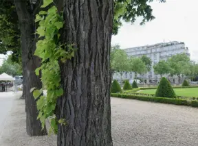 Tree-lined square or avenue, with four rows of tall lime trees, shell sand floor, and regal consulate and museum buildings.