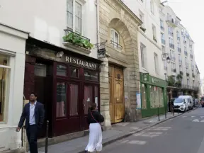 An ancient, pretty street with upscale shops in attractive storefronts. It leads south to the Seine River.