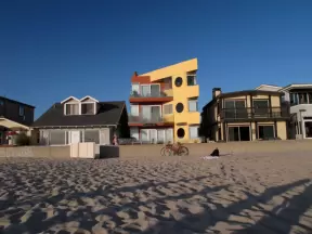 Wide beach with an abundance of white sand in a neighborhood of chic beach houses.