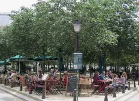 Charming, leafy square on an island in the middle of the Seine River, with cafes and jeux de boules court.