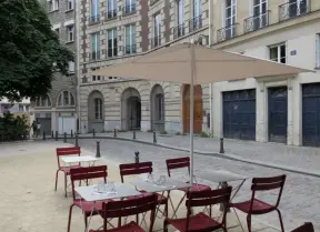 Charming, leafy square on an island in the middle of the Seine River, with cafes and jeux de boules court.