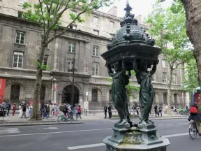 Incredible, large garden near the Sorbonne with flowerbeds, palace, circular pool with toy boats, statues, and tree canopies.
