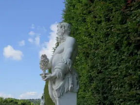 Glorious gardens with classical statues, fountains, topiaries, reflecting pools with bronze sculptures, flowers, orangerie, and secret groves.