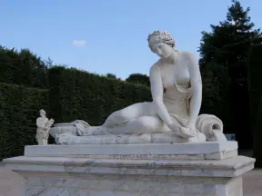 Glorious gardens with classical statues, fountains, topiaries, reflecting pools with bronze sculptures, flowers, orangerie, and secret groves.