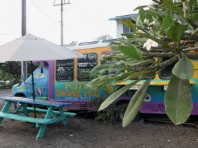 Magical little spot with grassy hills, strung lights, picnic tables, and food trucks.