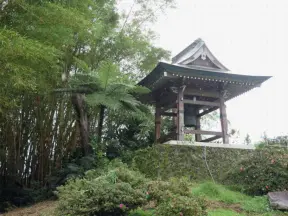Pleasant garden with waterfall, huge lizards, boulders, pavilions with lovely circle windows and distinctive roofs, and pond, but some city noise.