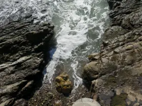 Rugged, beautiful cove with interesting rocks, sea glass, and shells on shore. Rock to climb, and water rushing into cove.
