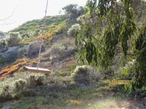 Lovely neighborhood walk past sweet houses and gardens, near fragrant hills with eucalyptus and wildflowers, plus a playground and lawn.