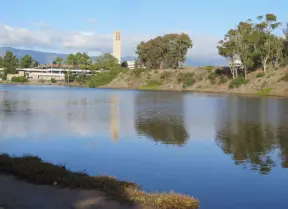 A walk past grassy knolls, a shimmering lagoon, and picturesque bluffs above the ocean, all in the vibrant atmosphere of campus!