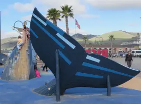 Cement ship playground with logs to climb, seal, dolphin, whale's tail and giant octopus sculptures, picnic tables, and an amazing view of Morro Rock and the inlet.