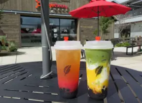 A colorful, spacious outdoor mall with boba tea, a toy store, and lots of teen clothing stores!
