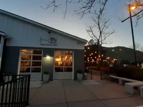 Trendy area with coffee shop, beer garden, wine bars, and cider bar, in industrial-style architecture with murals.
