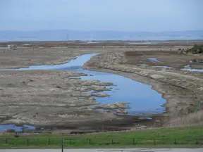 A magical clear pond with tadpoles and ducks, healthy eucalyptus trees with big leaves, winding salt marsh, and boardwalk.