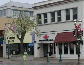 A charming strip of cafes and beautiful square in downtown Redwood City.