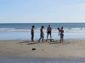 Lively beach with lawn, cypress trees, and lots of people having fun.