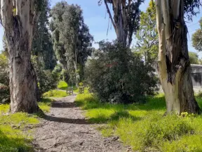 Lovely path beside a eucalyptus forest, on both sides of the creek, with workout stations, in a residential neighborhood. You can walk two miles total. Also called San Luis Ranch.