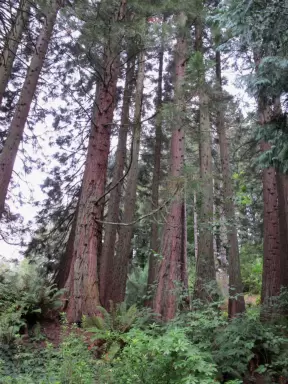 A redwood forest that looks like Northern California, with a playground and spacious knolly lawn.