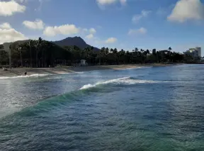 A jetty with a gazebo on the end, in the heart of Waikiki Beach. A popular bodyboarding and snorkeling spot where the reef is inches from your knees!