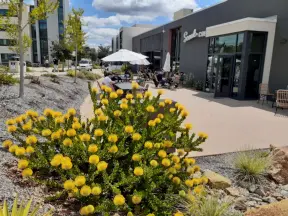 Upscale, colorful plaza in farmhouse style, with modern cafes. Kids climb on a huge log. The fire pit is fantastic at night, surrounded by eucalyptus trees.