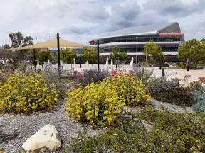 The huge UCSD campus, with stark architecture and minimal landscaping but some eucalyptus forest, near wonderful La Jolla town.