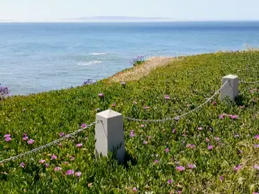 Stretch of grass with a paved walkway, flower beds, wonderful ocean views to Avila Beach, and monterey cypress trees.