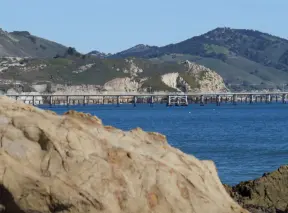 A pretty beachside town, with a wooden pier and wide windy beach with perfect views of Morro Rock, and colorful houses with gardens, backed by gently-sloping hills.