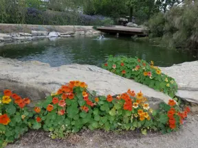 A peaceful 3-mile walk through oaky forest, past lush landscaping and a park with a historic adobe house, and among a neighborhood with gardens filled with flowers.