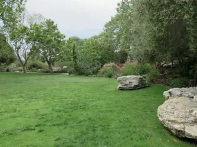 A park of exquisite beauty, with flowering trees and a picnic lawn fronting a pond full of turtles and koi.