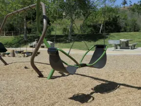 Park with plenty of benches in the shade, accessible playground with unusual equipment, tire swing, dome climby, wooden truck, dinosaur and dolphin bouncy, and plenty of swings.